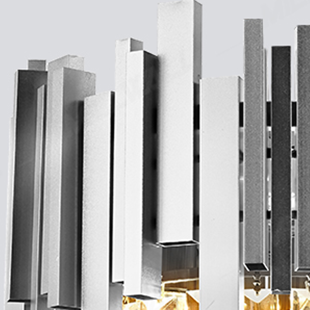 Designul sau compact, imbogatit cu cristale transparente, creeaza un joc subtil de lumina si stralucire, evidentiind eleganta unei incaperi fara a o incarca vizual. Finisajul argintiu aduce un plus de luminozitate si versatilitate, fiind usor de integrat in decoruri moderne sau clasice.