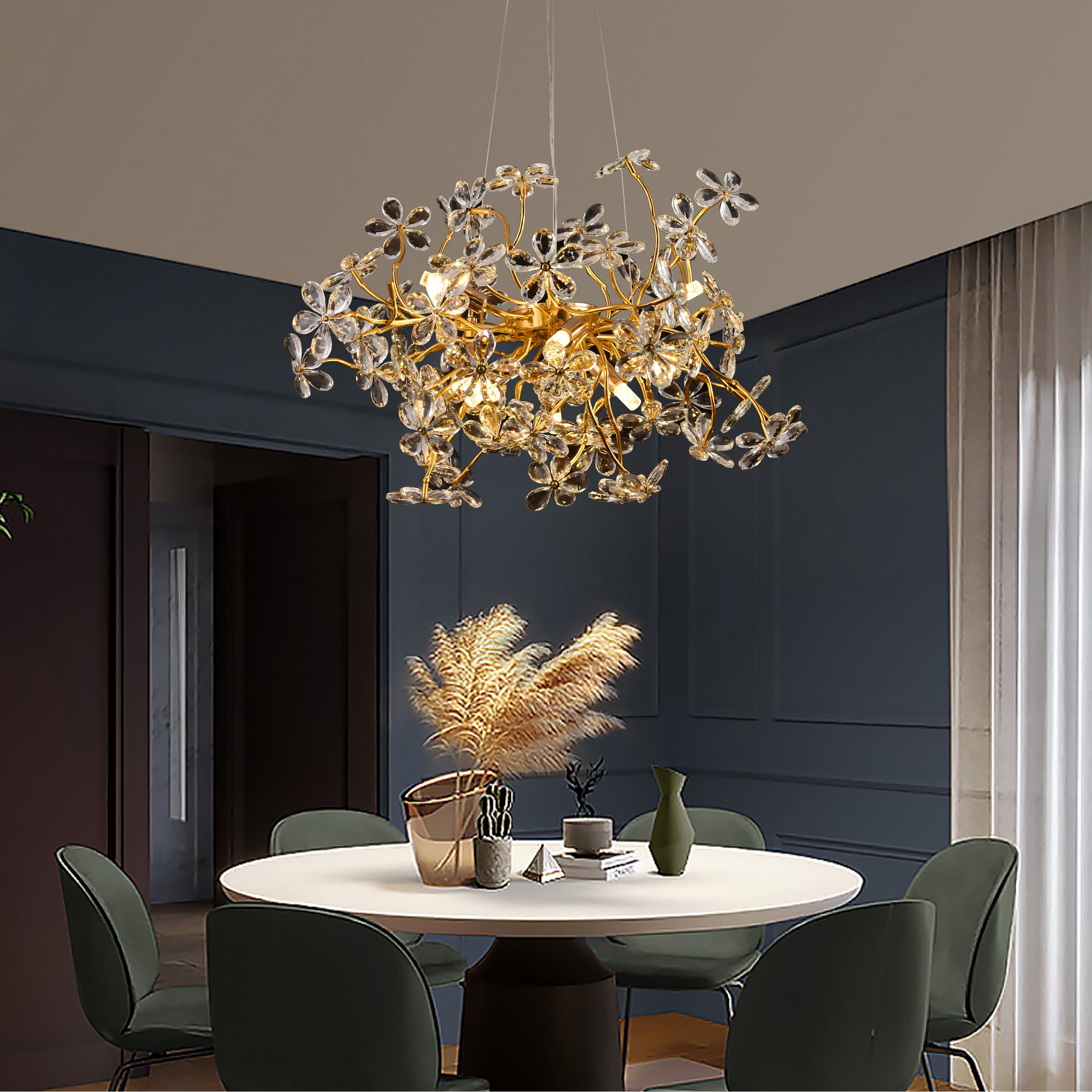 Candelabrul din cristal CM325/600GD este un corp de iluminat elegant, cu design modern și accente luxoase, ideal pentru interioare rafinate. Echipat cu 9 socluri G9, oferă o iluminare eficientă și uniformă, potrivită pentru livinguri, dininguri sau holuri sofisticate.