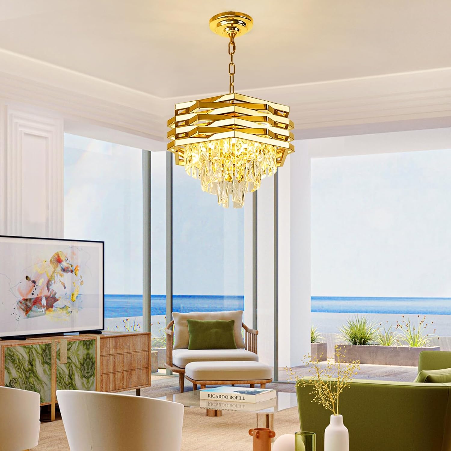 Structura metalică în finisaj auriu susține elemente decorative din cristal atent șlefuit, care reflectă și refractă lumina într-un joc spectaculos de străluciri. Cristalele amplifică intensitatea luminoasă și creează o atmosferă caldă și primitoare, adăugând profunzime și eleganță încăperii.