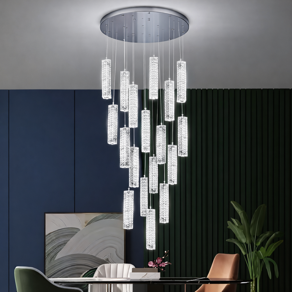 Candelabru Cristal LED 82W Crom, Lumina Calda/Neutra/Rece 3000K/4000K/6000K Amiri, Diametru 40cm x Inaltime 300cm, Cristal si Metal