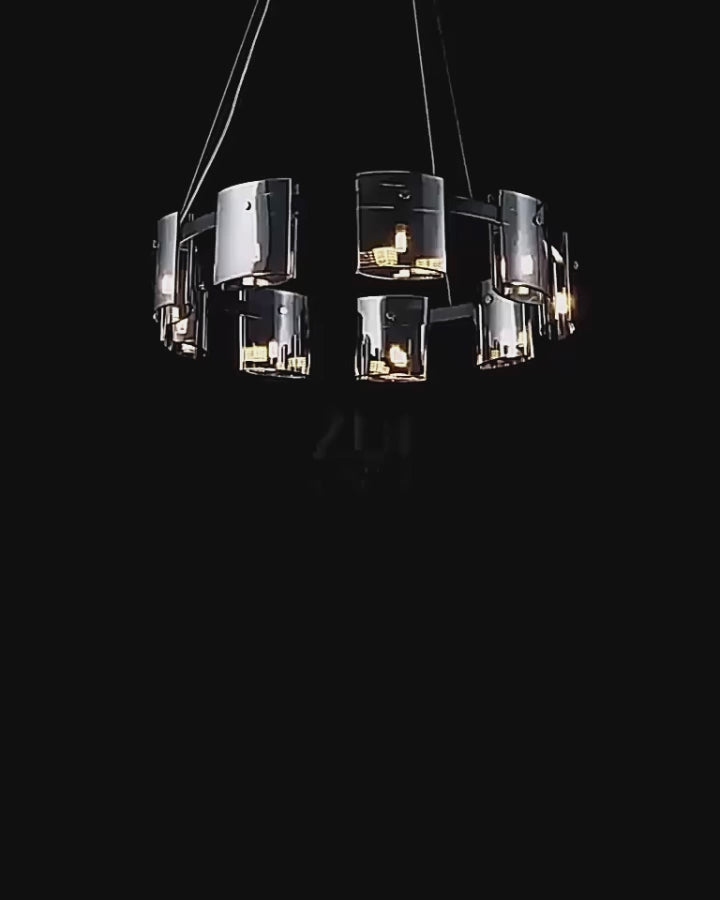 Un candelabru cu forma circulara si aspect solid, conceput pentru incaperi cu volum. Finisajul negru si sticla fumurie creeaza un contrast placut si un joc de lumina discret, dar eficient. O alegere potrivita pentru cei care cauta o piesa de iluminat cu greutate vizuala si structura ordonata.