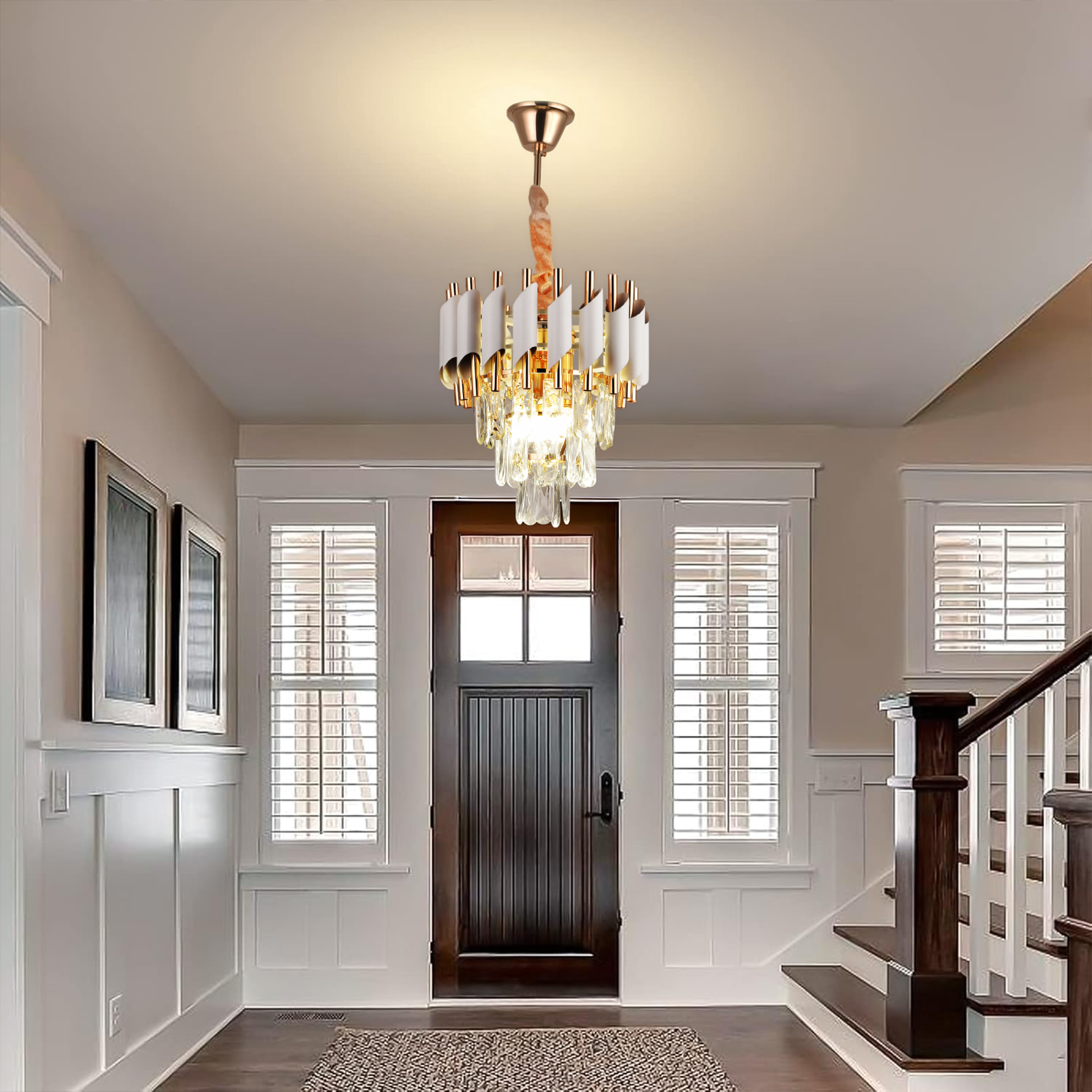 Candelabrul din cristal VERSAILLES Petito este o piesă elegantă de iluminat, concepută pentru interioare rafinate în care detaliile fac diferența. Combinația dintre finisajul auriu lucios și elementele albe, alături de cristalele atent dispuse, creează un efect vizual luminos și sofisticat, potrivit pentru spații intime și bine definite.