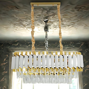 Un candelabru cu structura din metal si cristal, gandit pentru camere mari si deschise. Lungimea de 80 cm il face potrivit deasupra unei mese, intr-un living, o bucatarie spatioasa sau chiar un birou amenajat cu bun simt.