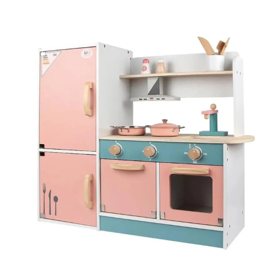 Jucarie tip Bucatarie Completa cu Accesorii Diverse si Frigider, 45 Piese, Turcoaz cu Roz, Lemn