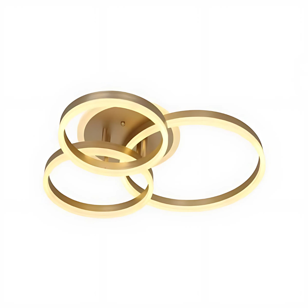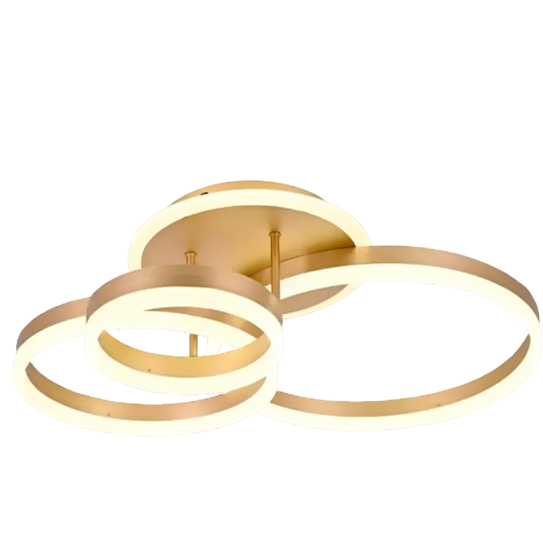 Finisajul auriu al structurii adaugă o notă de lux și căldură, transformând lustra RIGA LILITH într-un punct focal atrăgător al spațiului. Cele 3 cercuri, dispuse într-o manieră echilibrată și modernă, asigură o distribuție uniformă a luminii, creând un ambient plăcut și confortabil.