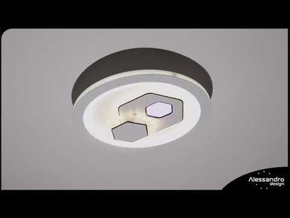 Designul elegant combina forma circulara cu elemente hexagonale, unul dintre acestea avand o lumina mov decorativa. Cu dimensiuni compacte de 20x20 cm si un profil subtire de 4 cm, lustra KATHLEEN se integreaza perfect in spatiile moderne.