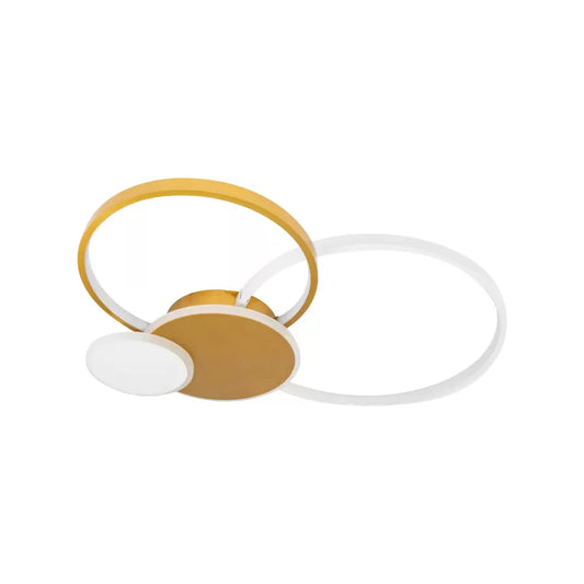 Cele șase cercuri, probabil de dimensiuni diferite sau aranjate într-un mod artistic, sunt iluminate de LED-uri cu posibilitatea de a selecta temperatura culorii. Prin intermediul telecomenzii, poți alege între lumină rece, caldă sau neutră, și poți ajusta intensitatea luminii datorită funcției de dimare. Combinația de auriu și alb adaugă o notă de eleganță și luminozitate designului. Cu o putere de 74W, este ideală pentru a ilumina livinguri mari, sufragerii sau alte spații ample.