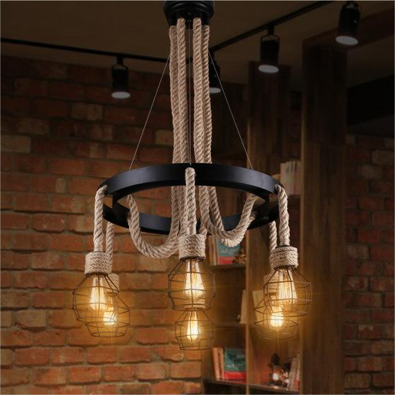 - Design Unic, Inspiratie Rustica: Cu o structura circulara ce imita o roata, din metal maro, completata de trei pendule impletite din sfoara naturala, aceasta lustra ofera o estetica autentica, amintind de fermecatoarele spatii traditionale.