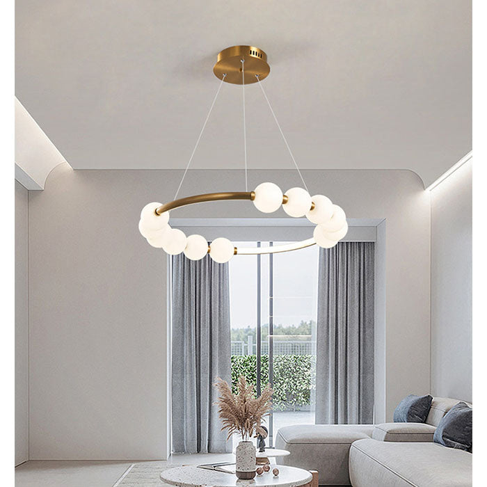 Lustra suspendată LED Nova, realizată din metal auriu și acril, îmbină eleganța modernă cu funcționalitatea avansată. Designul său rafinat oferă un efect decorativ spectaculos, fiind ideal pentru livinguri, zone de dining sau spații cu decor contemporan. Este echipată cu telecomandă pentru reglarea intensității luminii și schimbarea temperaturii de culoare între 3000K, 4000K și 6000K, adaptând ambianța după preferințe. Sursele LED integrate asigură iluminare uniformă, eficiență energetică și durată lungă de viață.