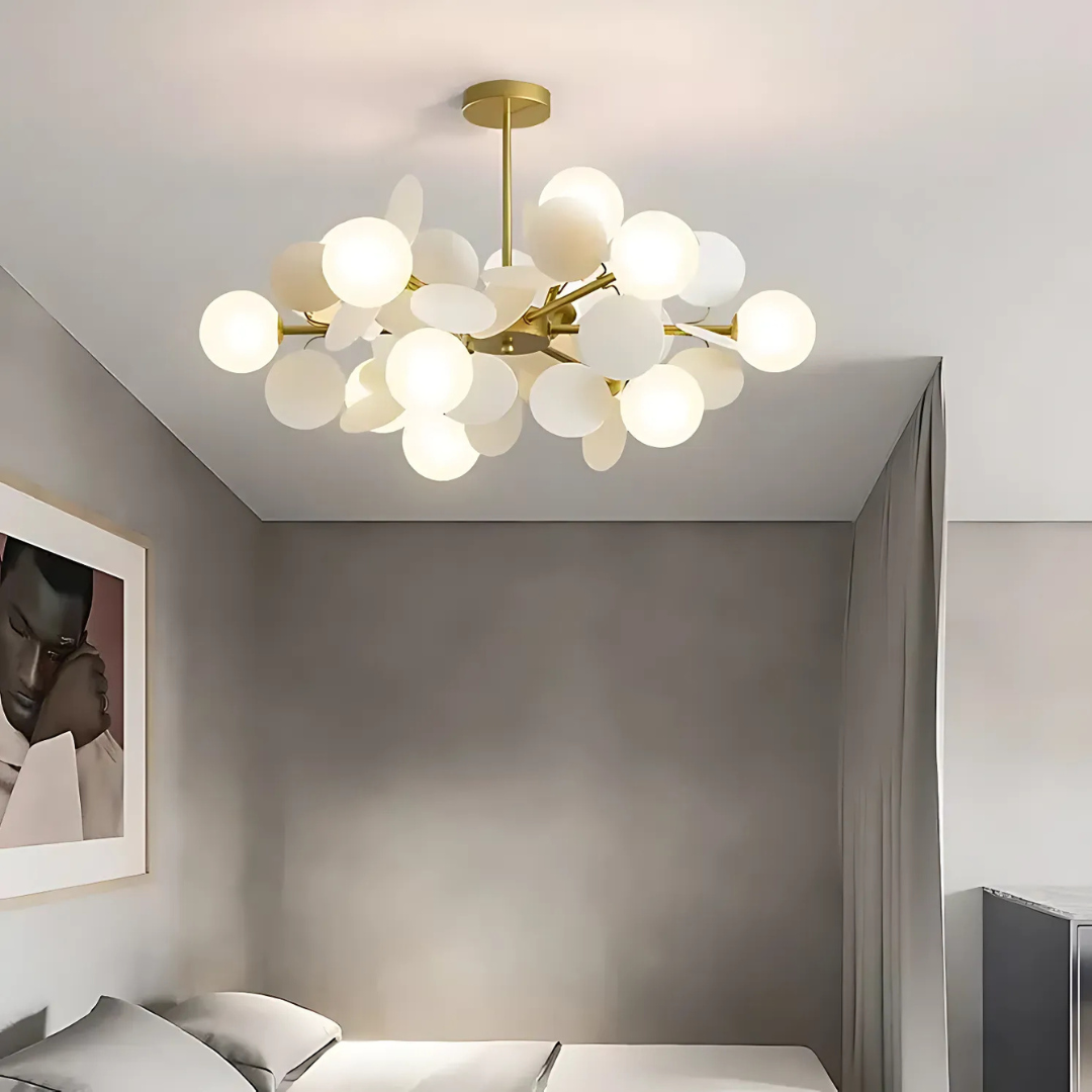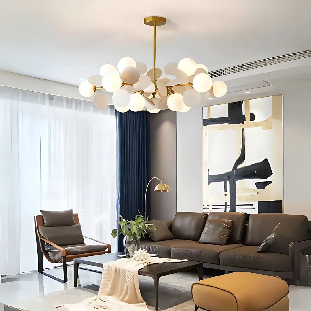 Lustra suspendata SVEN, 15x G9, alb, imbina eleganta moderna cu un design curat si rafinat. Cu o structura din metal auriu si globuri opace albe, se potriveste perfect in livinguri, dormitoare sau zone de relaxare.