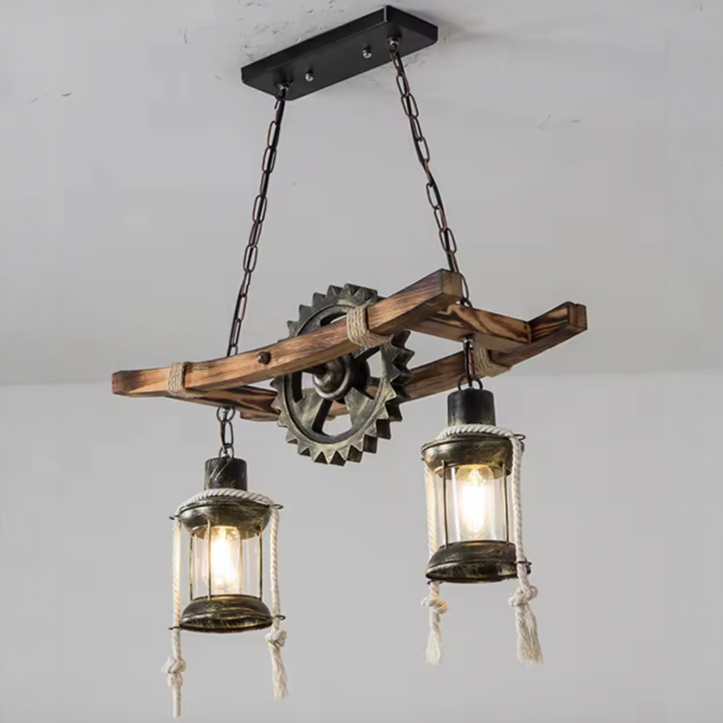 Elementele decorative tip frânghie adaugă caracter și autenticitate, transformând lustra într-un accent vizual distinct, ușor de integrat în amenajări farmhouse, loft sau rustice.
