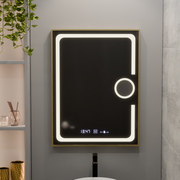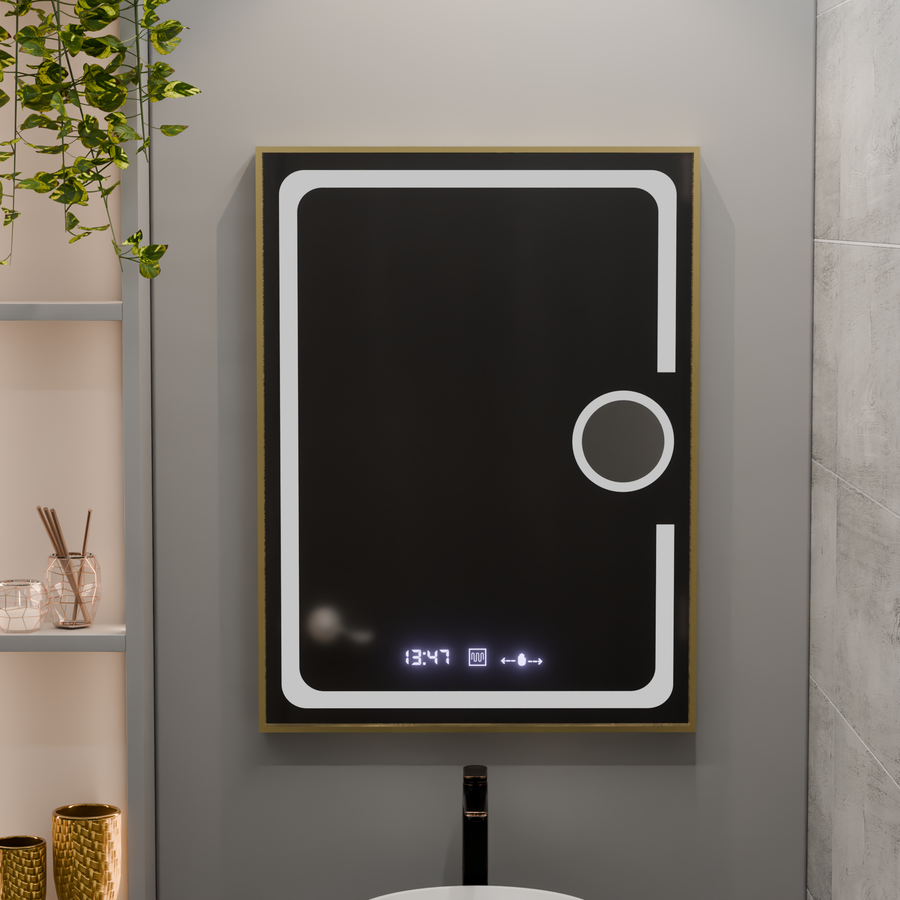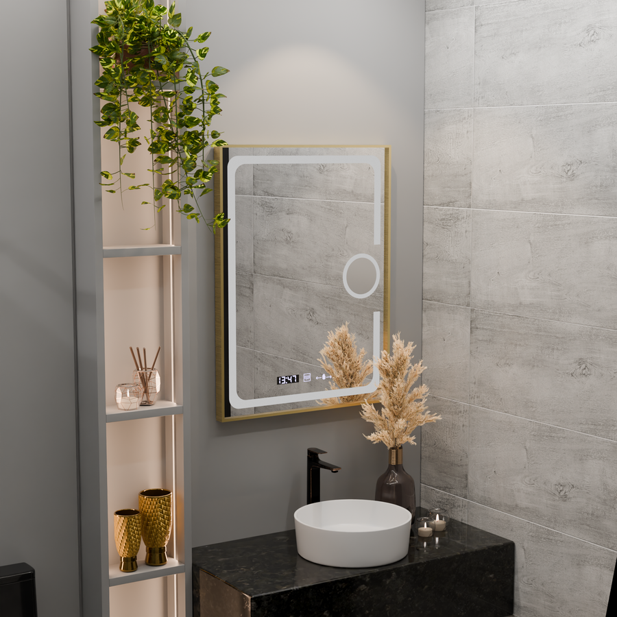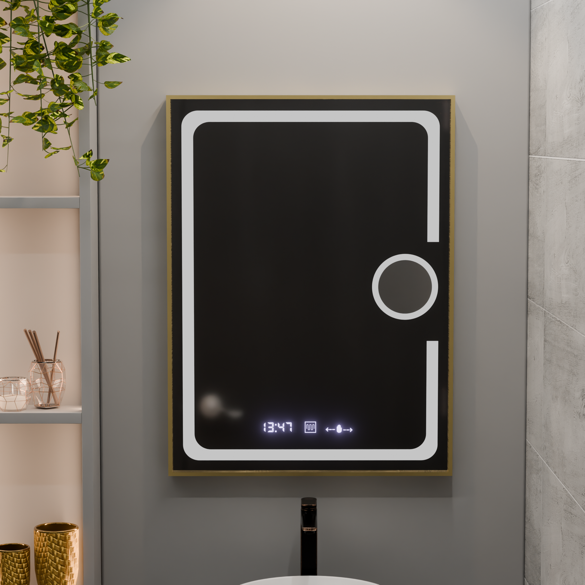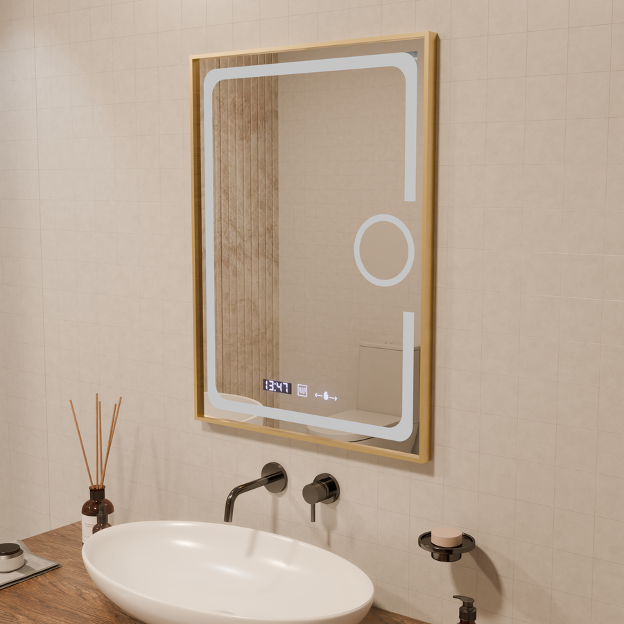 Oglinda LED Rectangulara, 60x80cm, Eclat MotionGlow Marcello, Sistem Dezaburire, Ceas & Termometru, Lupa Cosmetica, Dimabila, Rama Auriu Brushed
