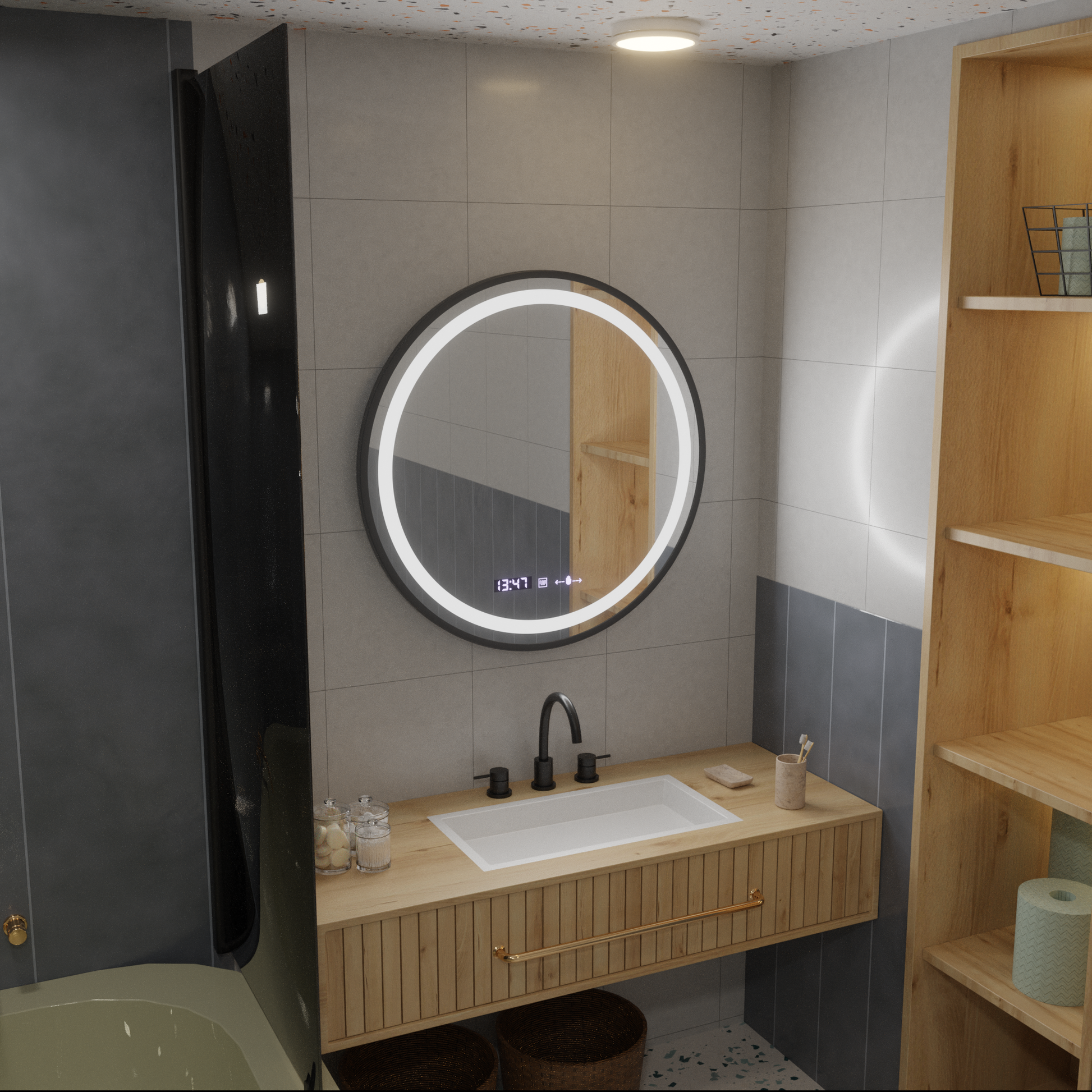 Îmbracă-ți baia într-o aură sofisticată cu oglinda LED Rotundă Celeste Majeste Noir MotionGlow Marcello. Cu un diametru generos de 60 cm și un finisaj negru profund, această oglindă devine un punct focal elegant, îmbinând un design modern cu tehnologie avansată pentru a-ți îmbunătăți rutina zilnică.